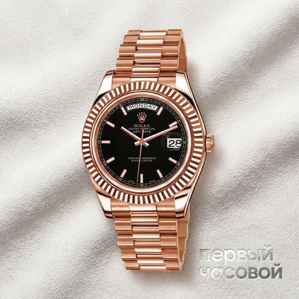 Rolex Day-Date II в корпусе из 18-каратного розового золота Everose представляет собой наиболее масштабную и архитектурно сложную интерпретацию флагманской линии мануфактуры. Увеличенный до 41 мм диаметр корпуса радикально меняет восприятие классического силуэта Oyster, делая акцент на широком рифленом безеле, геометрия которого обеспечивает интенсивное преломление света. Запатентованный сплав Everose, содержащий долю платины, гарантирует химическую инертность материала: розовый оттенок не теряет насыщенности под воздействием ультрафиолета или хлорированной воды. Интегрированный браслет President с полукруглыми трехрядными звеньями оснащен скрытой застежкой Crownclasp, создавая эффект непрерывности золотого полотна. Механическое сердце часов — мануфактурный калибр 3156 с парамагнитной синей спиралью Parachrom и высокоэффективными противоударными амортизаторами Paraflex, разработанными специально для корпусов увеличенного размера. Апертуры даты и дня недели расположены на традиционных позициях, сохраняя историческую преемственность референса.