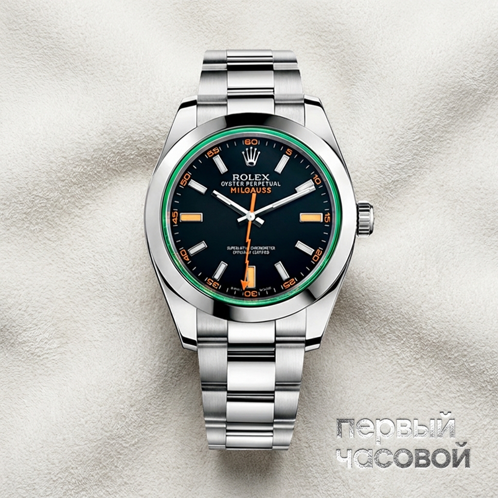 Rolex Milgauss reference 116400GV представляет собой современную техническую интерпретацию модели, изначально разработанной для научного сообщества ЦЕРН в середине XX века. Архитектура 40-миллиметрового корпуса Oyster из стали 904L скрывает в себе внутренний экран из ферромагнитных сплавов, обеспечивающий защиту механизма от магнитных полей индукцией до 1000 гаусс. Визуальной доминантой данной версии является уникальное зеленое сапфировое стекло (Glace Verte), производство которого требует сложнейшего технологического процесса, не имеющего аналогов в индустрии. Циферблат характеризуется строгой геометрией меток с люминесцентным покрытием Chromalight, а оранжевая секундная стрелка в форме молнии служит прямой исторической отсылкой к первым референсам коллекции. Внутри корпуса работает мануфактурный калибр 3131 с автоподзаводом, оснащенный парамагнитной синей спиралью Parachrom и анкерным колесом из никель-фосфорного сплава для минимизации магнитного воздействия. Часы комплектуются стальным браслетом Oyster с полированными центральными звеньями и раскладывающейся застежкой Oysterclasp с удлиняющим звеном Easylink.