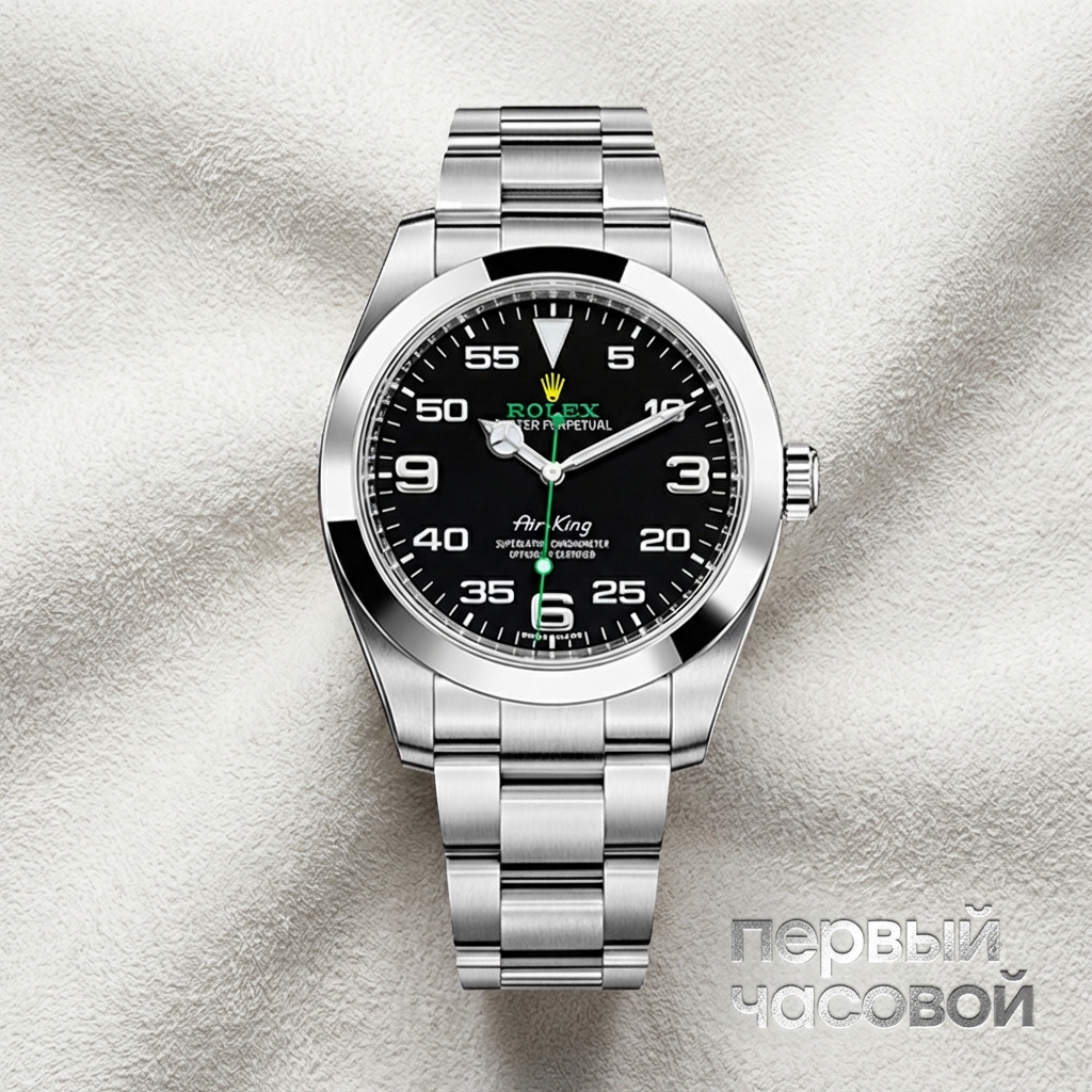 Rolex Air-King в корпусе диаметром 40 мм представляет собой радикальное переосмысление авиационного наследия бренда, объединяя историческую лаконичность с архитектурой модели Milgauss. Корпус из стали Oystersteel отличается характерным профилем с защитой заводной головки и полностью полированным безелем, который визуально расширяет циферблат. Главной особенностью референса 116900 является черный циферблат с сатинированием, дизайн которого вдохновлен приборной панелью сверхзвукового автомобиля Bloodhound SSC. Впервые в истории мануфактуры на циферблате применено сочетание желтой короны и зеленой надписи Rolex, а накладные часовые метки 3, 6 и 9 из 18-каратного белого золота соседствуют с минутной разметкой для навигационного считывания времени.