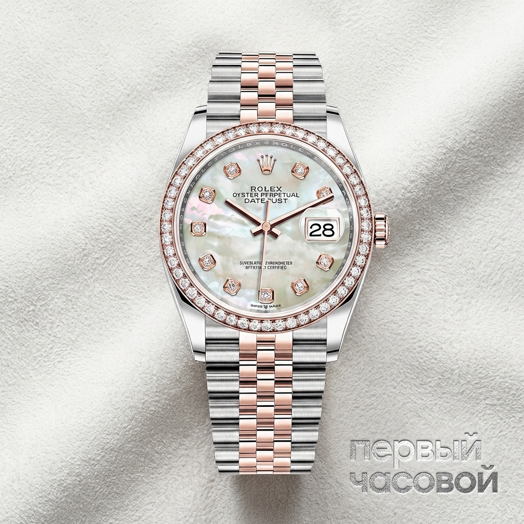 Rolex Datejust 36 в биколорном исполнении Rolesor демонстрирует синтез утилитарной прочности стали Oystersteel и эстетики 18-каратного золота Everose. Архитектура корпуса диаметром 36 мм сохраняет классические пропорции, однако в референсе 126281RBR акцент смещен на безель, инкрустированный бриллиантами классической огранки. Данное решение трансформирует визуальное восприятие модели: вместо строгого ритма традиционного рифления здесь доминирует сложная игра света, создаваемая драгоценными камнями.