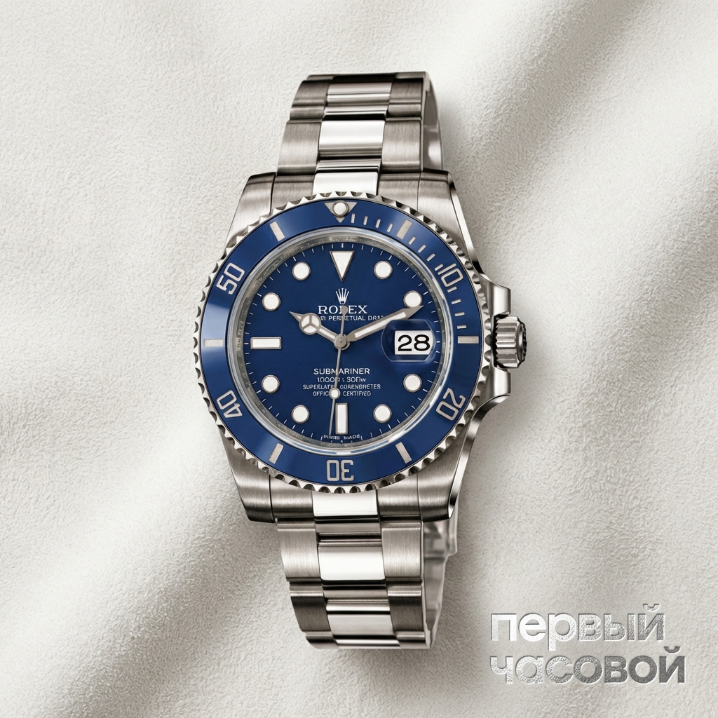 Rolex Submariner Date в редком исполнении из 18-каратного белого золота представляет собой значимую веху в архивах мануфактуры, являясь первой моделью коллекции, выполненной в данном драгоценном сплаве. Архитектура корпуса диаметром 40 мм следует канонам «Super Case», отличаясь от стальных аналогов более массивными ушками и расширенной защитой заводной головки Triplock. Визуальная идентификация модели строится на использовании фирменного синего оттенка, который заполняет как плоскость лакированного циферблата, так и керамическую вставку безеля Cerachrom, устойчивую к ультрафиолету и коррозии. Накладные часовые метки и стрелки выполнены из золота и заполнены люминесцентным составом Chromalight для читаемости в условиях отсутствия освещения. Внутри корпуса функционирует мануфактурный калибр 3135, сертифицированный хронометр COSC, обеспечивающий работу усложнения даты под циклопной линзой. Браслет Oyster с системой точной регулировки Glidelock завершает конструкцию, обеспечивая баланс тяжелого корпуса на запястье. Отсутствие сопроводительной документации и коробки переносит акцент исключительно на физическое состояние предмета и его статус снятого с производства референса.