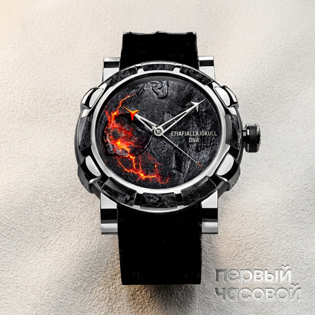 Romain Jerome Eyjafjallajokull DNA представляет собой концептуальный образец высокого часового искусства, где геологическая история интегрирована непосредственно в архитектуру корпуса. Модель диаметром 46 мм обладает массивной геометрией, характерной для периода расцвета оверсайз-форматов, и выполнена с акцентом на тактильные свойства материалов. Центральным элементом композиции является циферблат, фактура которого имитирует поверхность растрескавшейся лавы, содержащий в своем составе подлинный вулканический пепел и породу исландского вулкана Эйяфьядлайёкюдль.