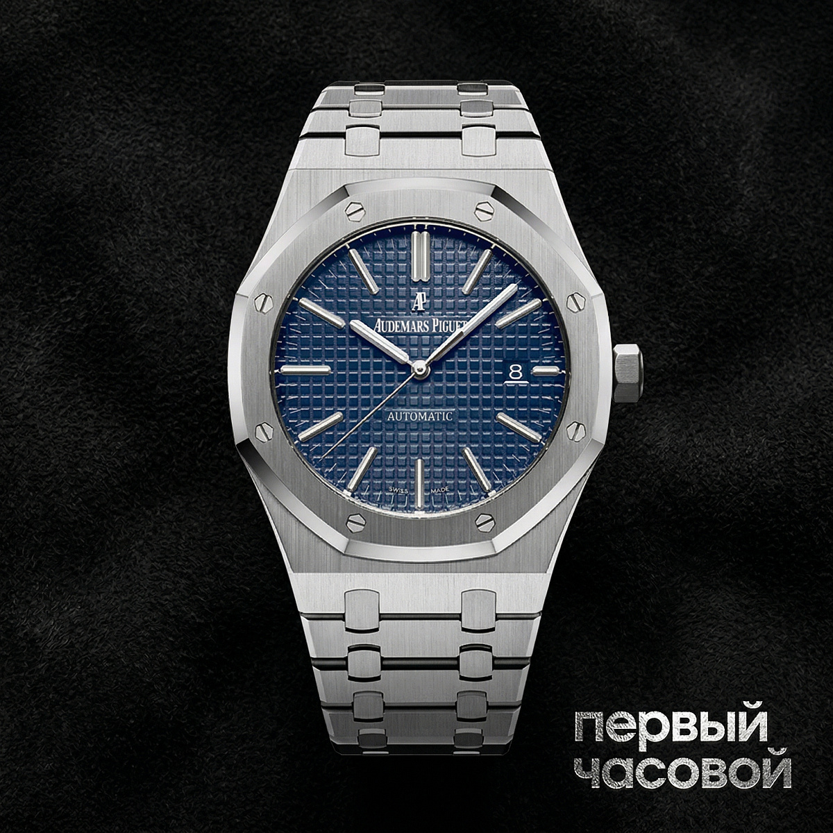 Циферблат модели, выполненный в глубоком синем оттенке, исторически ассоциирующемся с бутиковыми лимитированными сериями бренда, обладает выраженной визуальной плотностью. Поверхность декорирована фирменным паттерном Grande Tapisserie — сложным рельефом, формируемым на старинных гильоширных машинах методом одновременного вырезания квадратных элементов и нанесения микроскопической ромбовидной сетки в углублениях. Эта техника создает динамичную игру света, меняющую насыщенность пигмента в зависимости от угла обзора. Индикация времени осуществляется посредством накладных граненых индексов со сдвоенной меткой в положении «12 часов» и классических стрелок Royal Oak. Все элементы индикации изготовлены из белого золота для предотвращения оксидации и заполнены люминесцентным составом для обеспечения считываемости при низкой освещенности. В позиции «3 часа» расположена апертура даты, где дискретный белый шрифт на темном фоне диска гарантирует оптимальную информативность, не нарушая строгой симметрии гильошированного полотна.