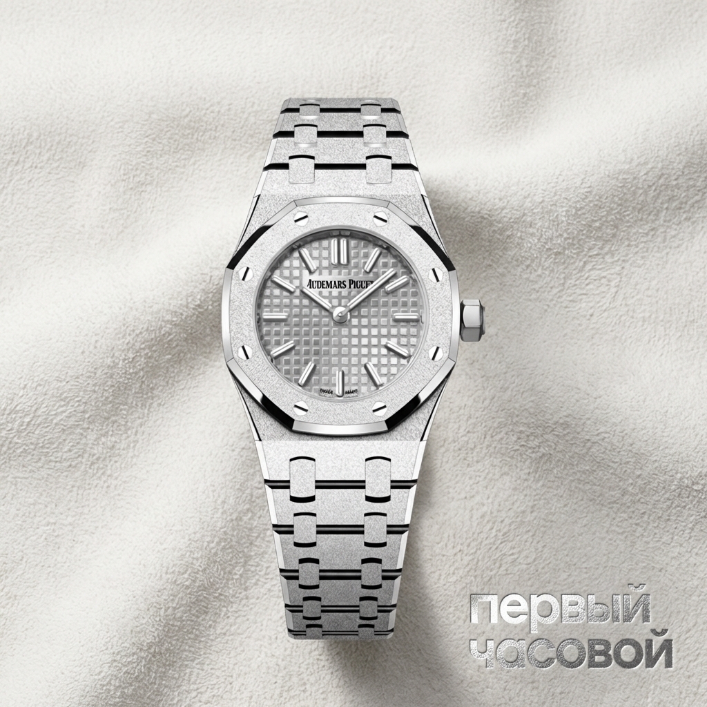 Audemars Piguet Royal Oak Mini Frosted Gold в корпусе из 18-каратного белого золота представляет собой ювелирную интерпретацию легендарной архитектуры Жеральда Дженты. Возвращение к историческому диаметру 23 мм переопределяет восприятие модели, смещая акцент с инструментальной функции на декоративную эстетику. Ключевой визуальной характеристикой выступает финишная отделка Frosted Gold, выполненная в старинной флорентийской технике: поверхность металла обрабатывается инструментом с алмазным наконечником, создавая микроскопические углубления, преломляющие свет подобно алмазной пыли, но сохраняющие монолитность материала.