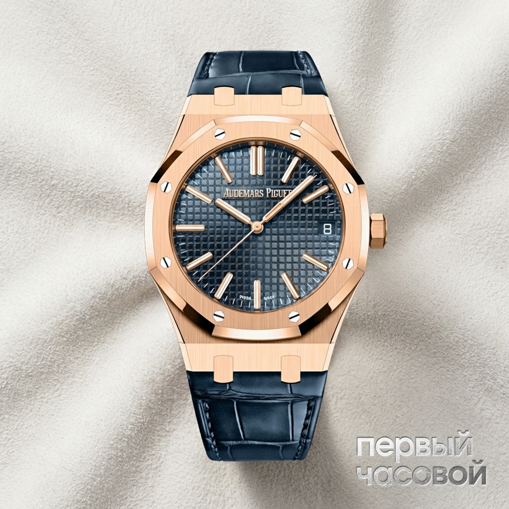 Перед нами референс 15510OR на коже, и это, пожалуй, самый прагматичный способ носить золотой Royal Oak. Полностью золотой браслет — это красиво, но непрактично: он весит как кастет, моментально покрывается царапинами и кричит о деньгах слишком громко. Вариант на ремне решает эти проблемы, оставляя только приятную тяжесть корпуса и статус драгметалла.