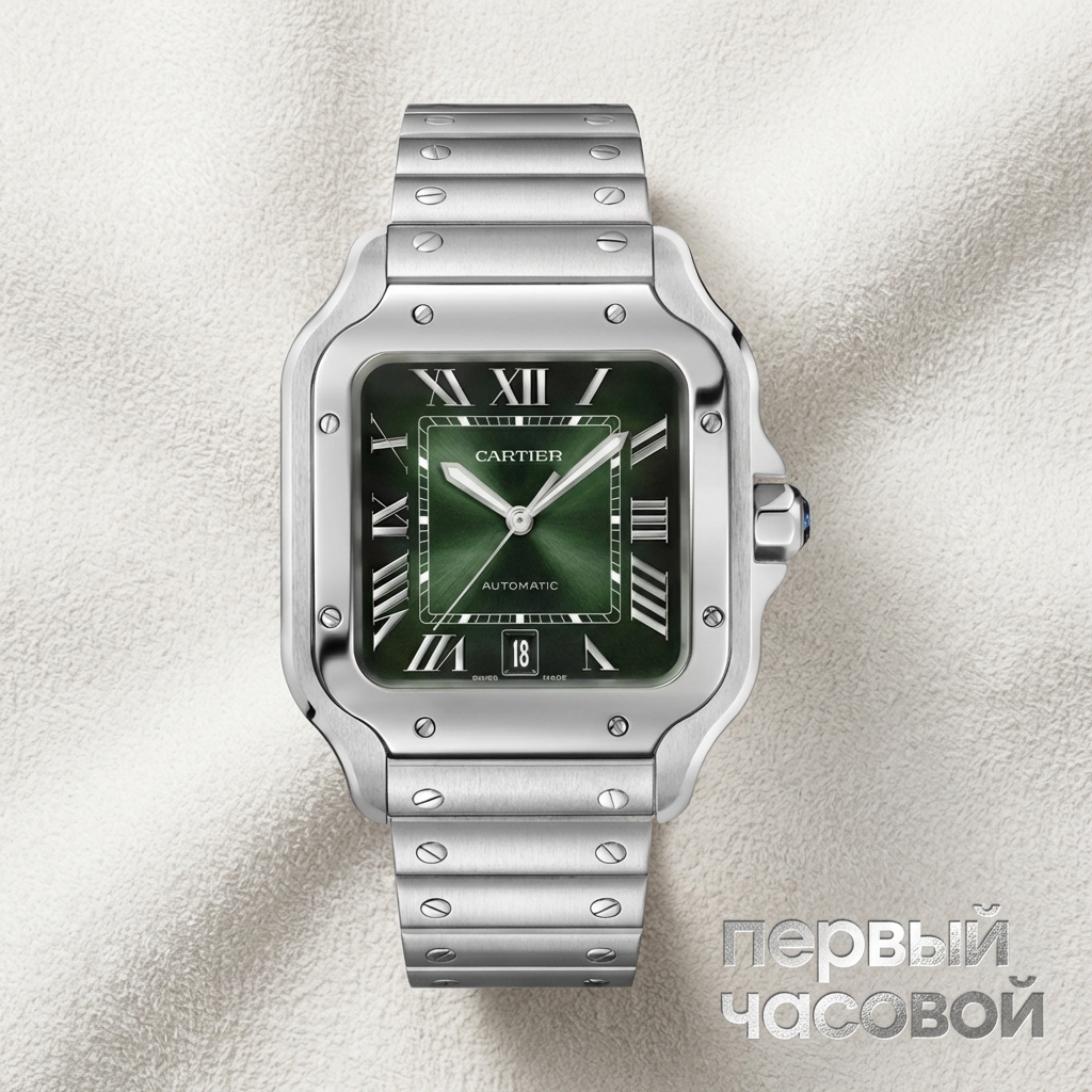 Cartier Santos de Cartier Large Model представляет собой современную эволюцию архетипического пилотского инструмента, переосмысленную через призму современной часовой архитектуры. Корпус из нержавеющей стали диаметром 39.8 мм сохраняет историческую геометрию квадрата с закругленными углами, где сатинированные поверхности контрастируют с полированным безелем, инкрустированным восемью функциональными винтами. Доминантой визуального восприятия выступает циферблат с градиентным зеленым покрытием и солнечным сатинированием, создающим игру света от изумрудного центра к затемненной периферии. Апертура даты интегрирована на отметке шести часов, не нарушая симметрию накладных римских цифр и мечевидных стрелок с люминесцентным покрытием.