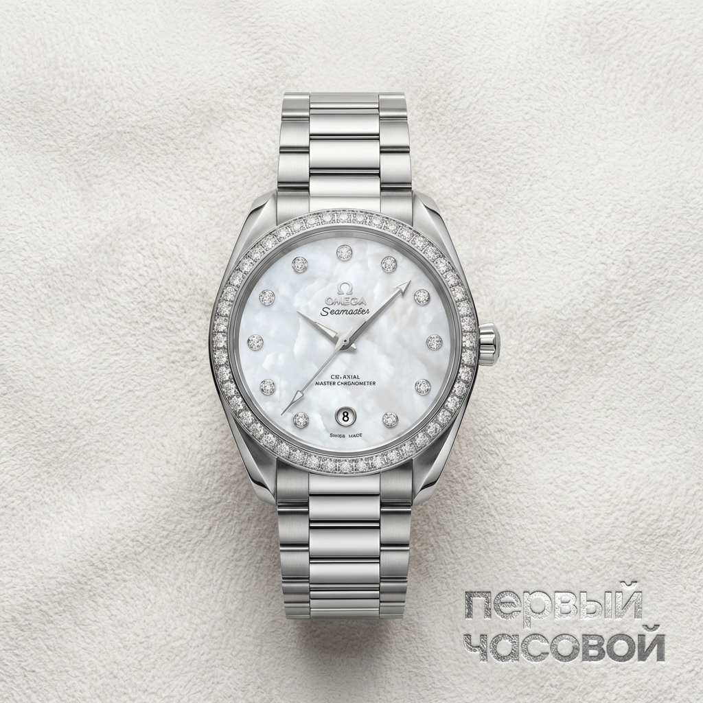 Omega Seamaster Aqua Terra представляет собой симбиоз морской утилитарности и высокого ювелирного искусства. Корпус диаметром 38 мм выполнен из полированной нержавеющей стали, архитектура которого определяется характерными витыми ушками, обеспечивающими эргономичную посадку и отсылающими к историческим моделям бренда. Визуальной доминантой выступает безель, инкрустированный бриллиантами классической огранки, который обрамляет циферблат из натурального белого перламутра. Часовые индексы также выполнены из драгоценных камнями в оправе, что не нарушает строгую геометрию круглой апертуры даты на позиции «6 часов». Задняя крышка с сапфировым стеклом открывает вид на мануфактурный калибр Omega 8800 с коаксиальным спуском и сертификацией Master Chronometer, гарантирующей устойчивость к магнитным полям до 15 000 гаусс. Экземпляр находится в заводских пленках, что подтверждает отсутствие следов эксплуатации и сохранение фабричной геометрии граней.