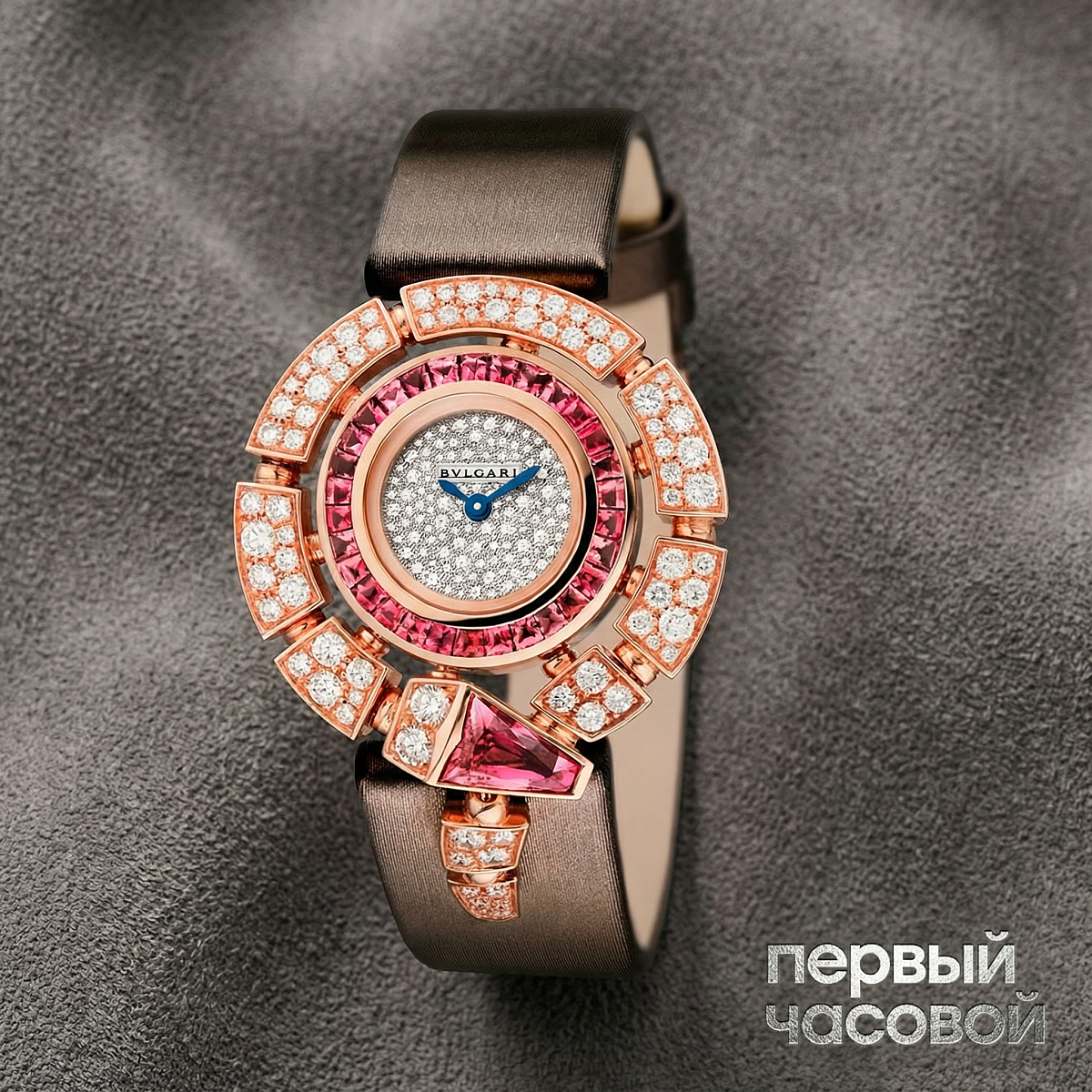 Ритейл в $46,500 тут не с потолка. Розовое золото, сапфиры и плотное "снежное паве" на циферблате — вы платите за вес драгметаллов и работу закрепщиков, а не за воздух. Кварцевый калибр B033 многих смущает, но для вечерних женских часов это плюс: их надевают раз в месяц, и никому не хочется каждый раз выставлять время и подзаводить пружину.