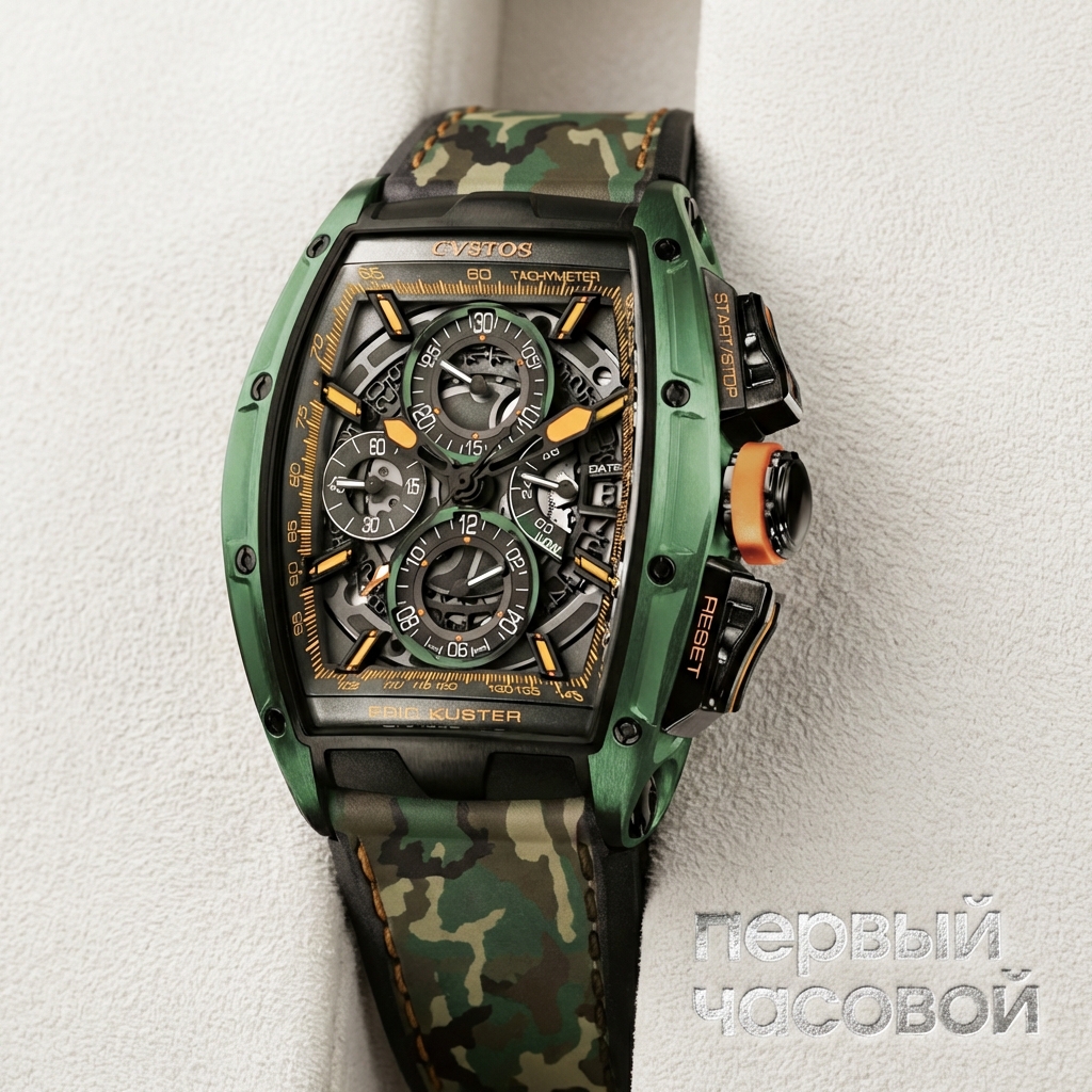 Cvstos Challenge Chrono II Eric Kuster представляет собой синтез авангардной часовой архитектуры и дизайнерского видения «Metropolitan Luxury». Массивный корпус бочкообразной формы, достигающий 53 мм по высоте, выполнен с применением PVD-покрытия, которое придает поверхности глубокий матовый оттенок, поглощающий свет и подчеркивающий сложную геометрию рантов. Конструкция корпуса спроектирована таким образом, чтобы визуально и физически интегрироваться с ремешком из канваса, создавая единую эргономическую линию на запястье. Скелетонизированный циферблат открывает обзор на работу автоматического калибра CVSTOS 577, демонстрируя мосты, ротор и колесную передачу как элементы декора.