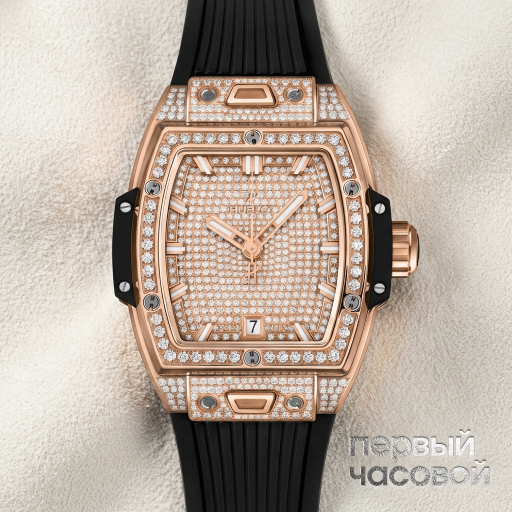 Давайте сразу определимся: перед нами не просто часы, а ювелирное изделие с функцией индикации времени. Референс с полным паве — это тяжелый люкс, который Hublot упаковал в свой фирменный форм-фактор «бочки». Размер 39 мм в данном случае работает как унисекс: золотой корпус King Gold, усыпанный камнями, на запястье ощущается увесисто и дорого. Сплав действительно крутой, он краснее обычного розового золота 5N и меньше тускнеет, но нужно понимать, что такая полировка и инкрустация требуют аккуратной носки — восстанавливать геометрию на камнях крайне сложно и дорого.
