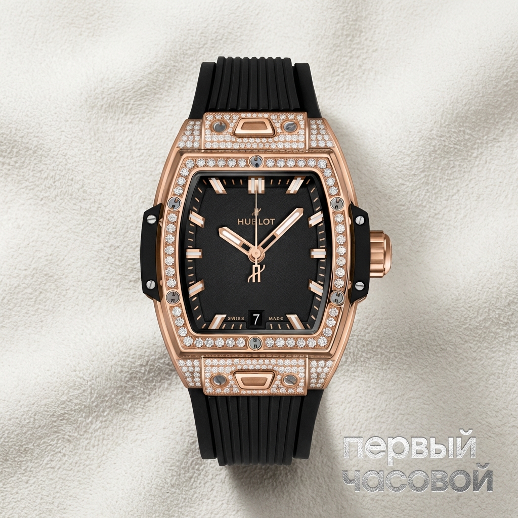 Hublot Spirit of Big Bang в корпусе диаметром 39 мм представляет собой архитектурную интерпретацию культовой эстетики бренда, адаптированную к геометрии «tonneau». Корпус выполнен из запатентованного сплава King Gold — 18-каратного золота с повышенным содержанием меди и добавлением платины, что обеспечивает материалу уникальный красный оттенок и исключительную устойчивость к окислению. Конструкция корпуса следует принципу «сэндвич», где многослойная структура подчеркнута шестью H-образными титановыми винтами на безеле. Сам безель инкрустирован бриллиантами классической огранки, создающими игру света и контрастирующими с матовыми поверхностями боковых граней.