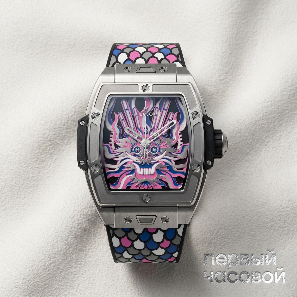 Hublot Spirit of Big Bang в титановом исполнении демонстрирует адаптацию фирменной эстетики «Art of Fusion» к архитектурной форме бочкообразного корпуса (tonneau). Корпус диаметром 42 мм выполнен из сатинированного и полированного титана, что обеспечивает высокие показатели удельной прочности при значительном снижении веса относительно стальных эквивалентов. Конструкция сохраняет характерную для мануфактуры структуру «сэндвич», где безель зафиксирован шестью функциональными H-образными винтами из титана, являющимися визуальной доминантой фронтальной проекции.