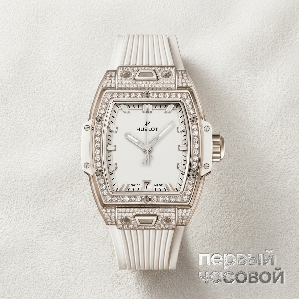 Hublot Spirit of Big Bang Titanium White Diamonds. Данный лот представляет собой архитектурную интерпретацию формы tonneau, выполненную в титане класса 5 с чередованием сатинированных и полированных граней. Корпус диаметром 39 мм демонстрирует характерную для мануфактуры «сэндвич-конструкцию», усиленную боковыми вставками из белой композитной смолы и шестью H-образными титановыми винтами.