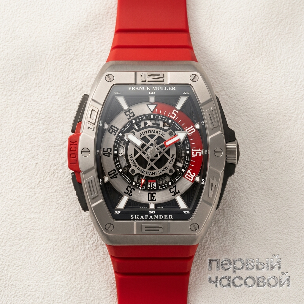Franck Muller Skafander представляет собой радикальную инженерную адаптацию культового силуэта Cintrée Curvex для условий повышенной эксплуатации. Уникальность данной модели заключается в интеграции дайверского функционала в сложную геометрию корпуса формы «бочка», что потребовало разработки проприетарной системы внутренней индикации времени погружения, управляемой внешними пушерами, поскольку установка классического вращающегося безеля на некруглый корпус технически невозможна.
