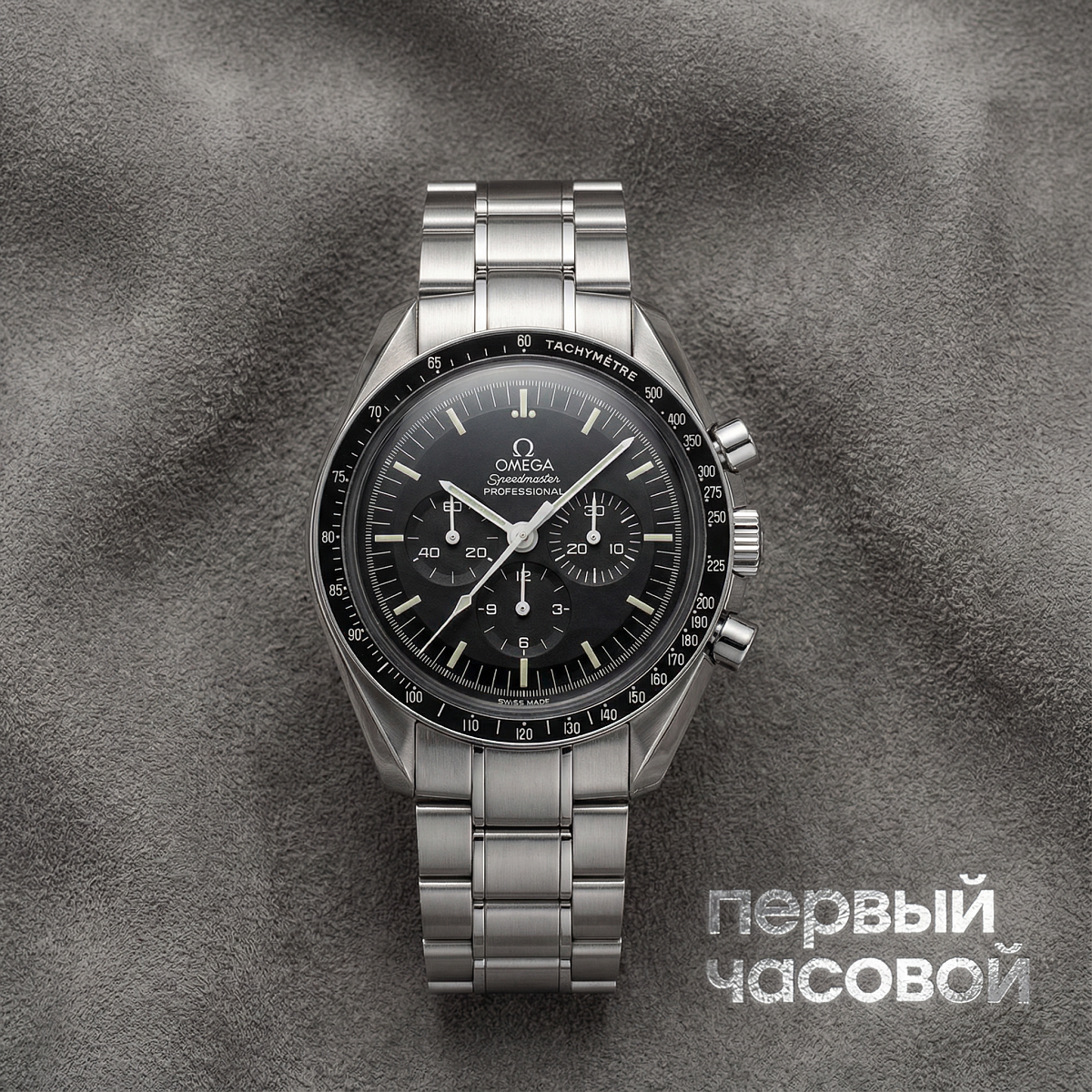 Стальной корпус диаметром 42 мм имеет толщину 13,8 мм, что обеспечивает сбалансированную эргономику на мужском запястье. Фронтальная часть защищена стеклом из хезалита (Hesalite) — специфической разновидности плексигласа, которая используется Omega в соответствии с историческими спецификациями Moonwatch для предотвращения рассыпания осколков при ударах. Внешний фиксированный безель оснащен тахиметрической шкалой, позволяющей проводить вычисления скорости движения на основе времени прохождения дистанции. Черный матовый циферблат с контрастной разметкой дополнен индикацией даты, расширяющей функциональные возможности классического хронографа.