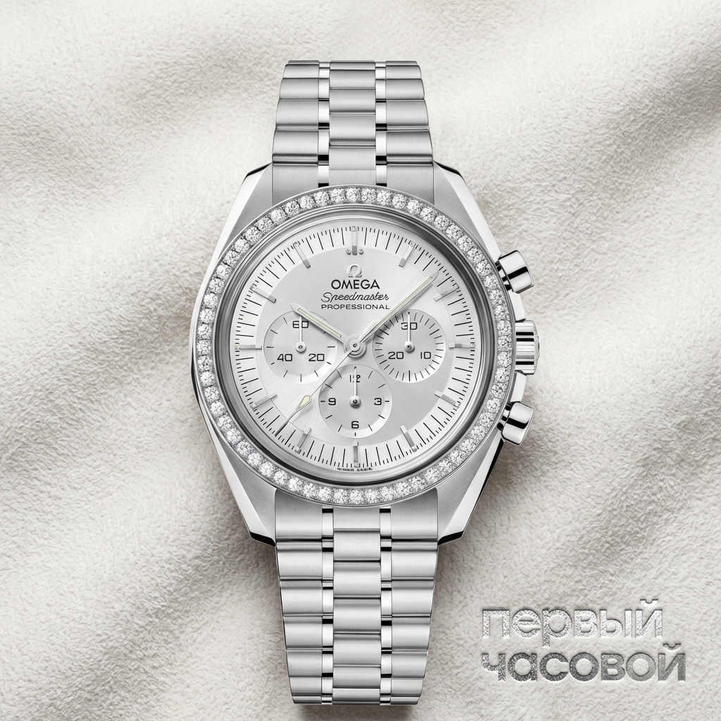 Omega Speedmaster в исполнении из белого золота диаметром 42 мм представляет собой монументальную версию хронографа, где утилитарная архитектура соединяется с высокими ювелирными характеристиками. Корпус с характерными лирообразными ушками и асимметричной защитой заводной головки выполнен из массивного сплава, обеспечивающего изделию существенный вес и специфический холодный блеск, отличный от стальных аналогов. Геометрия безеля и кнопок управления хронографом сохраняет канонические пропорции, в то время как финишная обработка металла демонстрирует чередование полированных и сатинированных плоскостей. Экземпляр находится в состоянии new old stock, сохраняя полный комплект заводских защитных пленок на фронтальных и тыльных элементах, что гарантирует отсутствие следов эксплуатации и контакта с внешней средой. Лот предлагается без оригинального коробочного сета и сопровождающей документации, акцент смещен исключительно на физическую сохранность предмета.