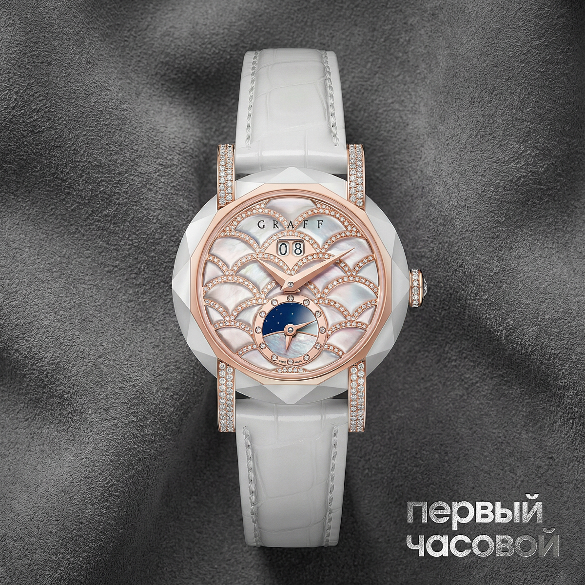 Архитектура корпуса построена на контрастном сочетании белой высокотехнологичной керамики и 18-каратного розового золота. Ювелирная отделка включает 435 бриллиантов общим весом 2,39 карата, которые интегрированы в безель и элементы циферблата. Основание из натурального перламутра служит фоном для сложной индикации: помимо центральных стрелок, на циферблате расположены указатель второго часового пояса (GMT) и индикатор времени суток «день/ночь». Особое место в композиции занимает усложнение «большая дата», реализованное через двойную апертуру для максимальной считываемости показаний. Лицевая сторона защищена сапфировым стеклом, устойчивым к внешним воздействиям.