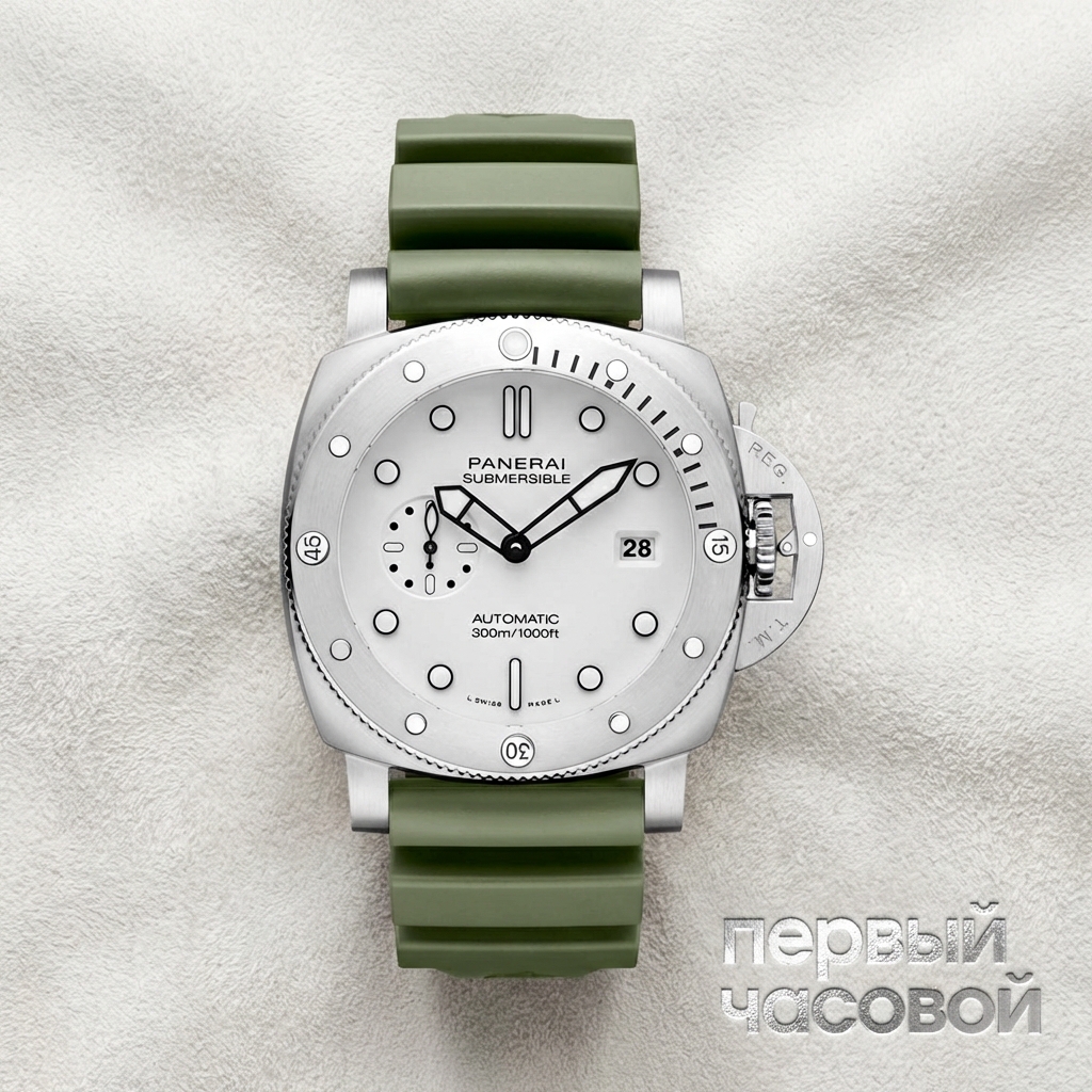 Возвращение к здравому смыслу. Долгое время линейка Submersible страдала от крайпостей: 47-миллиметровые модели были откровенными «шайбами» не для каждого запястья, а 42-миллиметровые версии старая гвардия воспринимала как компромисс. Размер 44 миллиметра — это именно тот форм-фактор, за который любят Panerai: часы крупные, заметные, но уже совместимые с реальной жизнью, а не только с гидрокостюмом. Белый циферблат (Bianco) работает на визуальное облегчение, часы не выглядят мрачным военным прибором, это скорее отличный вариант под летний гардероб и загар.