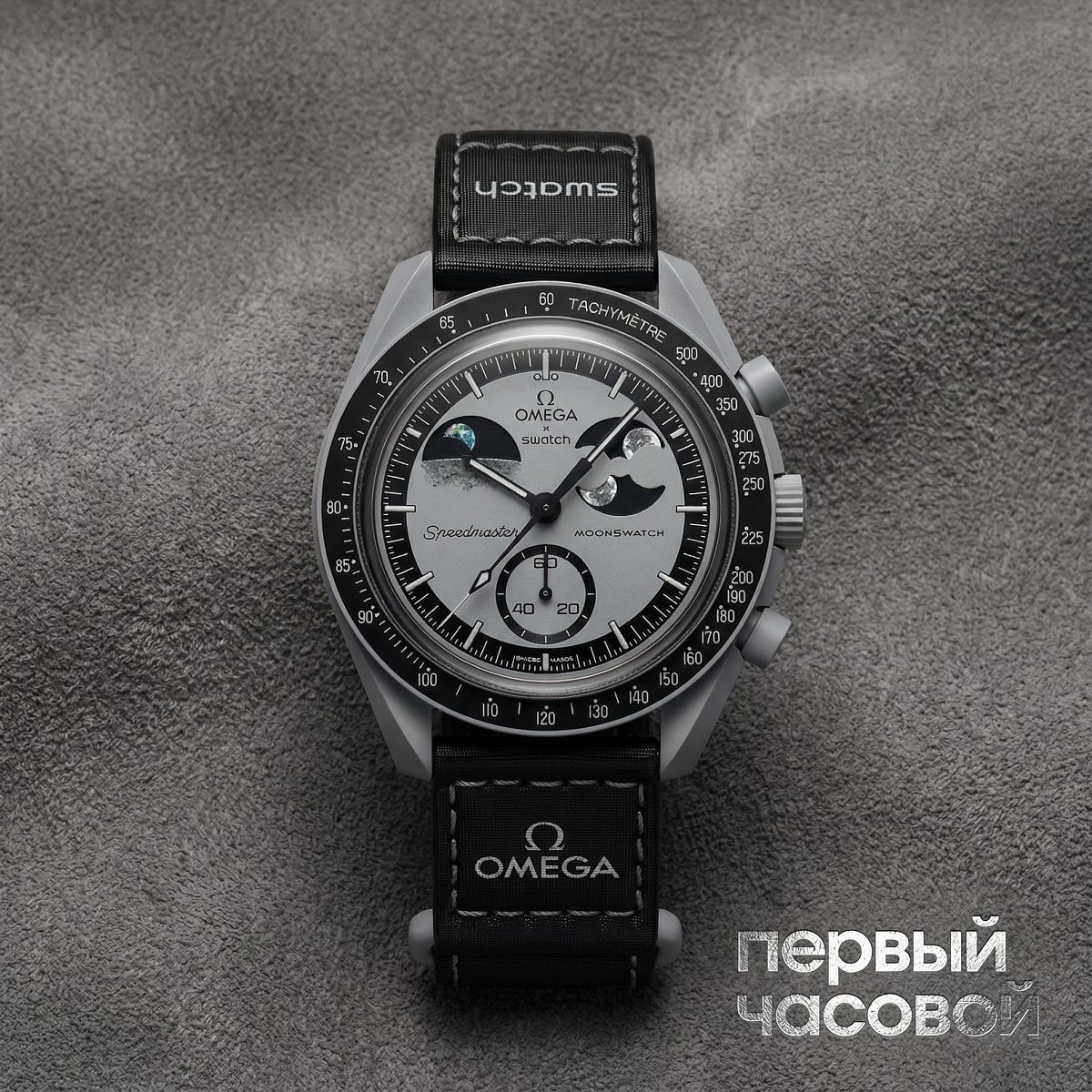 Функциональность прибора дополнена черным безелем с тахиметрической шкалой и акцентными светло-серыми маркерами. За считывание показаний в темноте отвечает люминесцентный состав Super-LumiNova® класса А с зеленым свечением, нанесенный на стрелки и часовые индексы. При этом увеличенные изображения Луны на диске фаз покрыты составом со свечением белого цвета. В центре боксового стекла из биосырья вытравлен символ «S», отсылающий к логотипу Swatch. Дизайн дополнен черным ремешком VELCRO® с контрастной строчкой и биокерамическим кольцом.