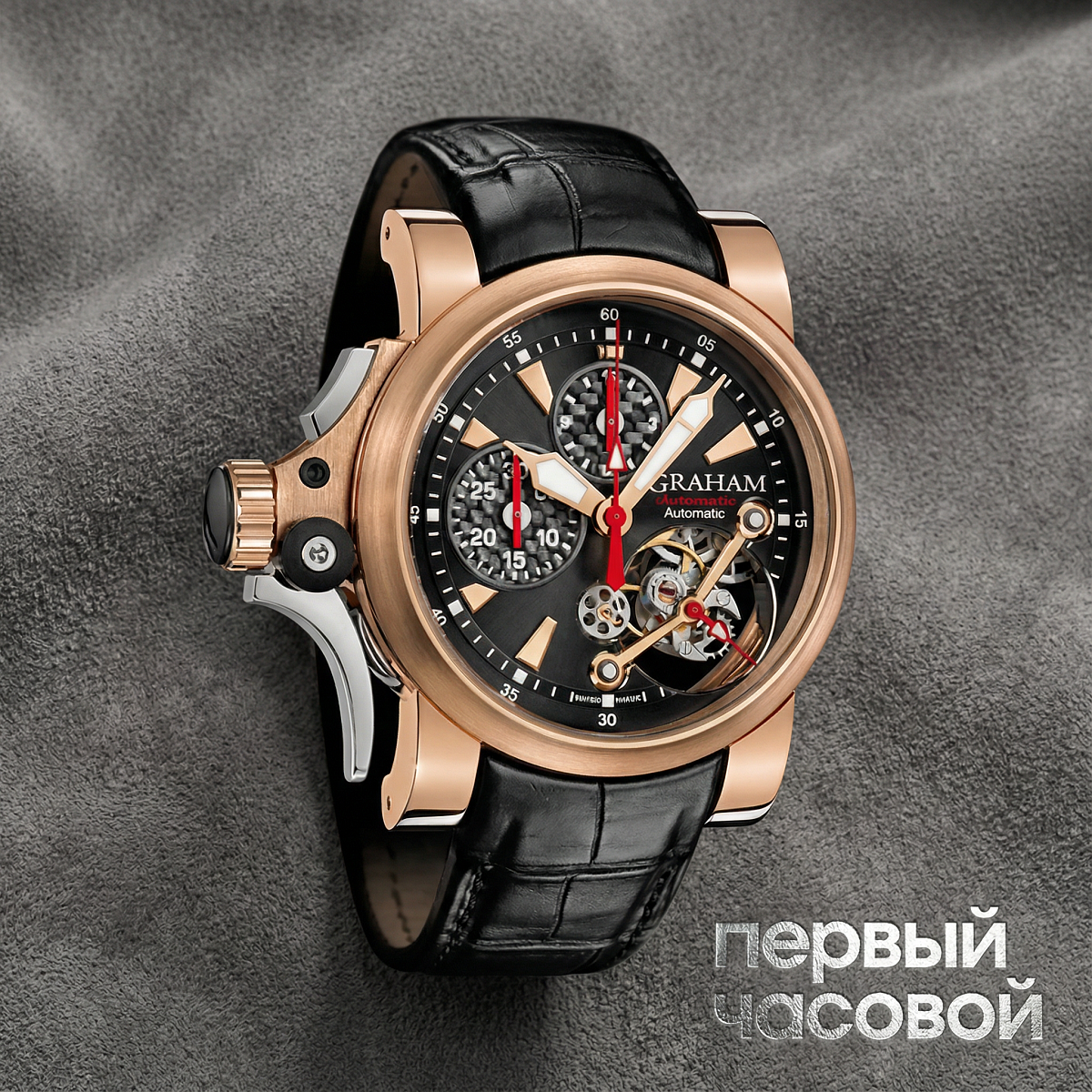 «Graham многие воспринимают как брутальные "шайбы" для экстремалов, но этот Турбиллограф — совсем другая лига. Здесь стоит мануфактурный калибр G1780, где турбийон и хронограф реально работают, а не просто крутятся для красоты, компенсируя гравитацию. Корпус 46 мм в розовом золоте — это тяжелый люкс в прямом смысле слова: на руке чувствуется вес, и под узкую манжету рубашки его не спрячешь.