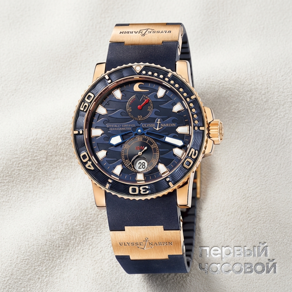 Ulysse Nardin Maxi Marine Diver в корпусе из розового золота представляет собой эталонный образец морской хронометрии, адаптированный к требованиям современной часовой архитектуры. Диаметр 42,7 мм обеспечивает монументальное присутствие на запястье, где теплая фактура драгоценного металла контрастирует с утилитарной эстетикой каучукового ремешка. Конструкция корпуса, обладающая водонепроницаемостью до 200 метров, дополнена сапфировым стеклом и защищенной заводной головкой, что гарантирует сохранность механического калибра с автоподзаводом в условиях повышенного давления. Визуальная доминанта циферблата сосредоточена на функциональности: апертура даты интегрирована без нарушения общей симметрии, сохраняя читаемость показателей. Данный экземпляр, сопровождаемый документами мануфактуры, демонстрирует сохранность геометрии и аутентичность исполнения.