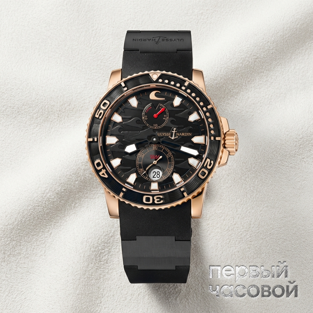 Ulysse Nardin Maxi Marine Diver представляет собой квинтэссенцию морского наследия мануфактуры, воплощенную в архитектурно сложном корпусе диаметром 42 мм. Данный референс отличается характерной геометрией ушек и массивным поворотным безелем с рельефной дайверской разметкой, выполняющим как защитную, так и инструментальную функцию. Циферблат, декорированный волнообразным гильоше, демонстрирует классическую компоновку морских хронометров: индикатор запаса хода расположен в верхней полусфере, а увеличенный малый секундный счетчик с интегрированной апертурой даты — в нижней.