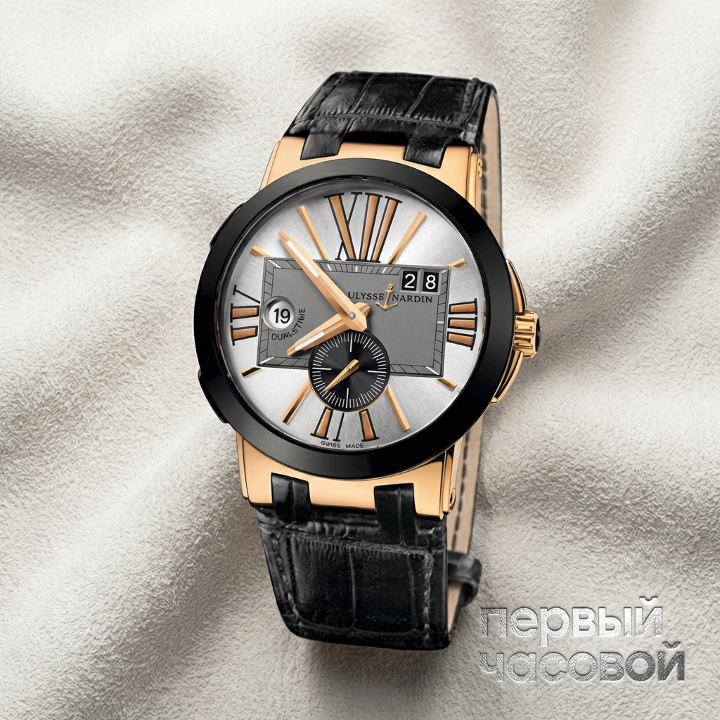 Ulysse Nardin Executive Dual Time представляет собой эталон функциональной механики, интегрированной в сложную архитектуру корпуса диаметром 43 мм. Модель Ref. 246-00-5/421 демонстрирует характерный для мануфактуры из Ле Локля подход к эргономике усложнений: запатентованная система быстрой смены часового пояса управляется керамическими пушерами, вынесенными на боковую грань корпуса, что исключает необходимость манипуляций с заводной головкой.