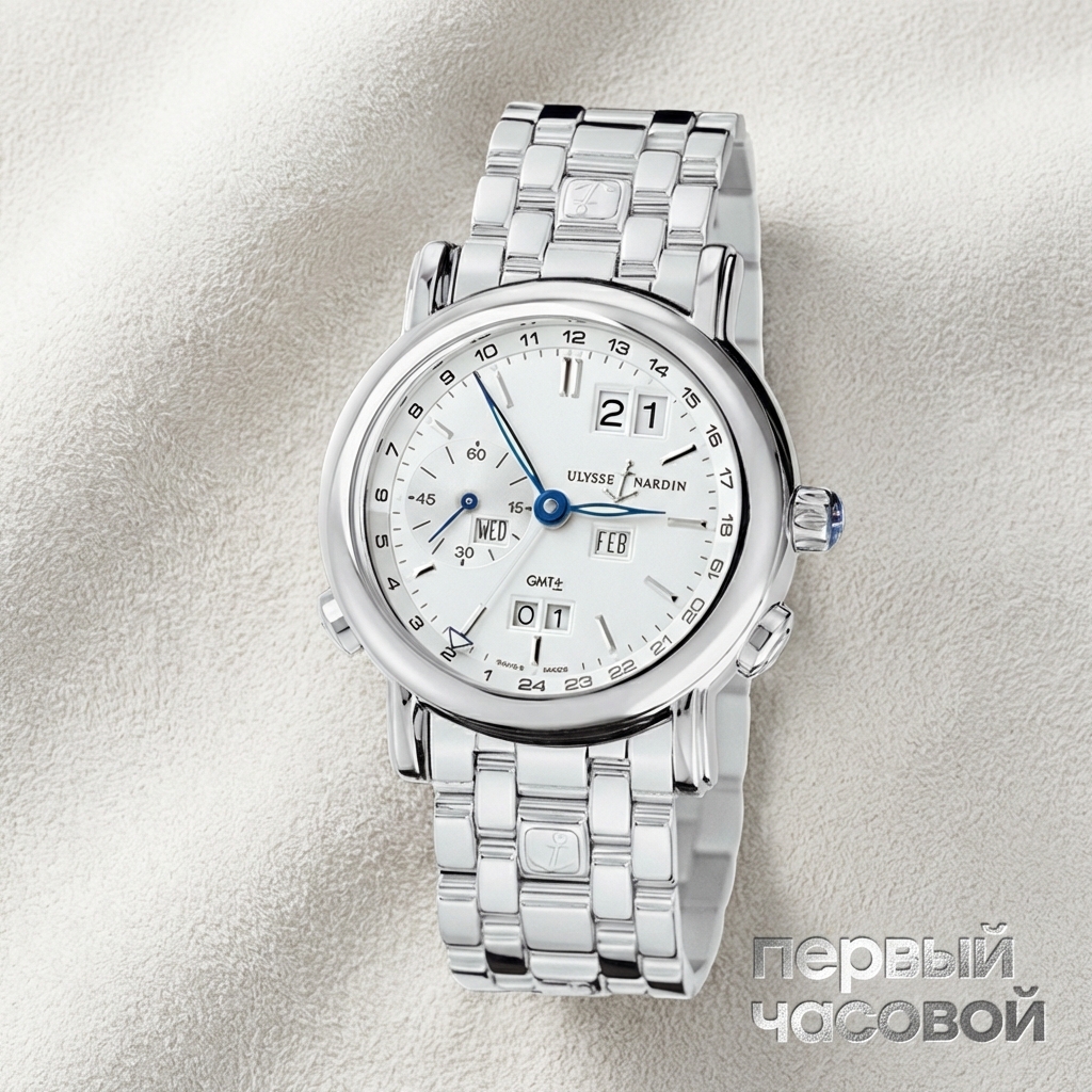Ulysse Nardin GMT Dual Time в корпусе из 18-каратного белого золота представляет собой образец неоклассической часовой архитектуры. Корпус диаметром 38 мм отличается строгой геометрией и сдержанными пропорциями, характерными для традиционного часового искусства, где эргономика превалирует над визуальной агрессией. Монолитность конструкции подчеркивается интегрированным браслетом из того же драгоценного металла, создающим непрерывную световую линию при взаимодействии с источниками освещения.
