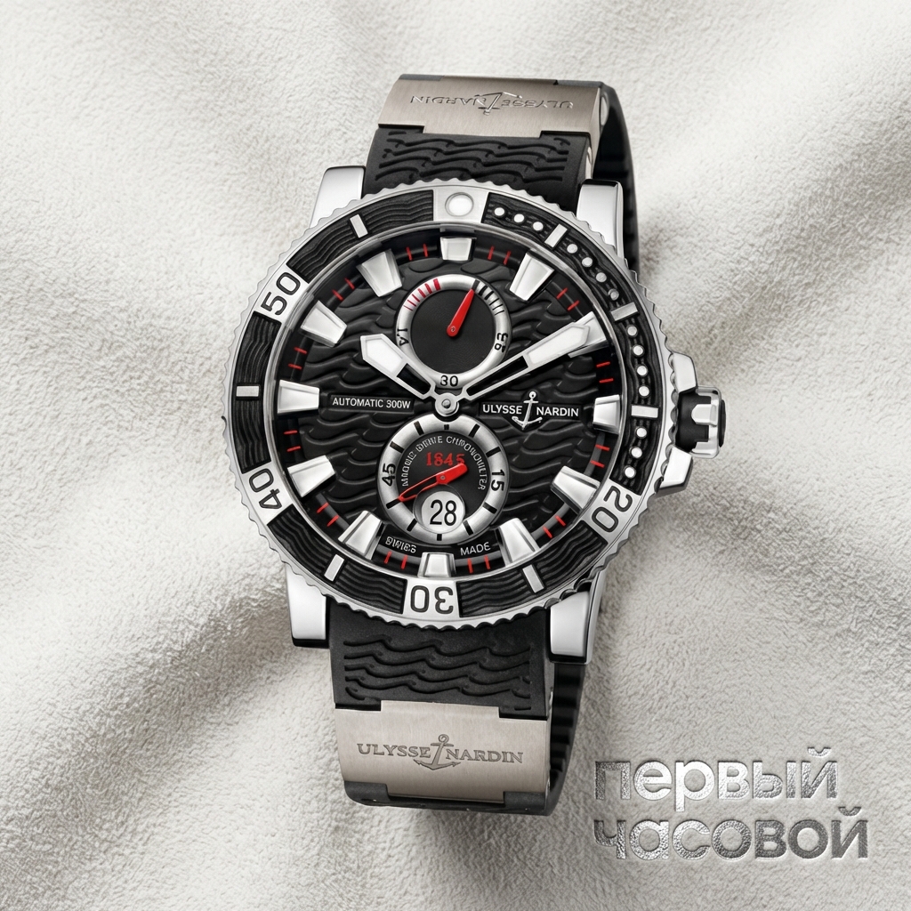 Ulysse Nardin Maxi Marine Diver представляет собой эталонную интерпретацию морского хронометра в формате наручных часов, объединяя историческое наследие мануфактуры с современной индустриальной архитектурой. Корпус диаметром 45 мм, выполненный из высококачественной нержавеющей стали, характеризуется массивным однонаправленным безелем с выраженным рифлением для удобства манипуляции. Геометрия ушек и боковых граней подчеркнута чередованием полированных и сатинированных поверхностей, создающих сложную игру света.