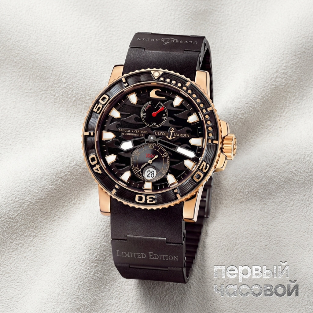 Ulysse Nardin Maxi Marine Diver представляет собой эталонную интерпретацию морского хронометра в формате наручных часов класса люкс. Корпус диаметром 42 мм, выполненный из 18-каратного розового золота (согласно номенклатуре референса 266), демонстрирует сложную архитектуру с характерными ступенчатыми ушками и массивной защитой заводной головки.