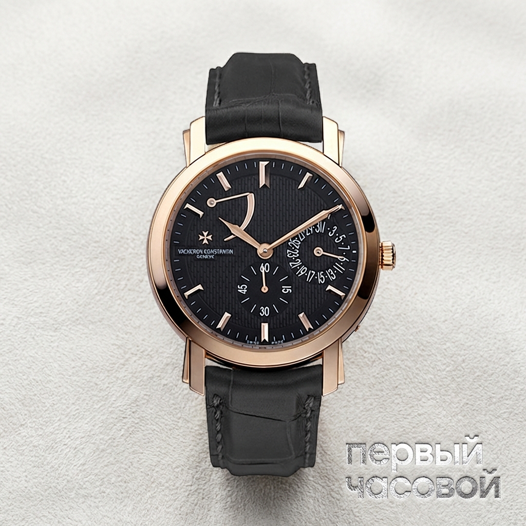 Vacheron Constantin Patrimony Traditionnelle представляет собой эталон академического часового искусства в корпусе из розового золота диаметром 38 мм. Архитектура модели выдержана в строгих канонах коллекции: ступенчатый корпус, характерное рифление на задней крышке и прямые, геометрически выверенные ушки крепления ремня.