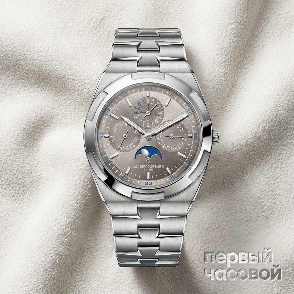 Vacheron Constantin Overseas Perpetual Calendar Ultra-Thin представляет собой симбиоз высокого часового искусства и спортивной архитектуры, исполненный в 18-каратном белом золоте. Корпус диаметром 41,5 мм отличается сложной геометрией с фирменным шестигранным безелем, стилизованным под мальтийский крест, и интегрированным браслетом, звенья которого продолжают заданную эстетику. Циферблат демонстрирует классическую раскладку вечного календаря с индикацией дня недели, даты, месяца и високосного года, дополненную апертурой фаз Луны в положении «6 часов». Особенностью данной модели является ее профиль: благодаря использованию мануфактурного калибра 1120 QP/1, толщина которого составляет всего 4,05 мм, общая высота корпуса не превышает 8,1 мм. Механизм с автоматическим подзаводом оснащен инерционным грузом из 22-каратного золота с изображением розы ветров, наблюдаемым сквозь сапфировое стекло задней крышки. Несмотря на сложность усложнения, часы сохраняют функциональность инструмента для путешествий, обладая водонепроницаемостью до 50 метров и защитой от магнитных полей.