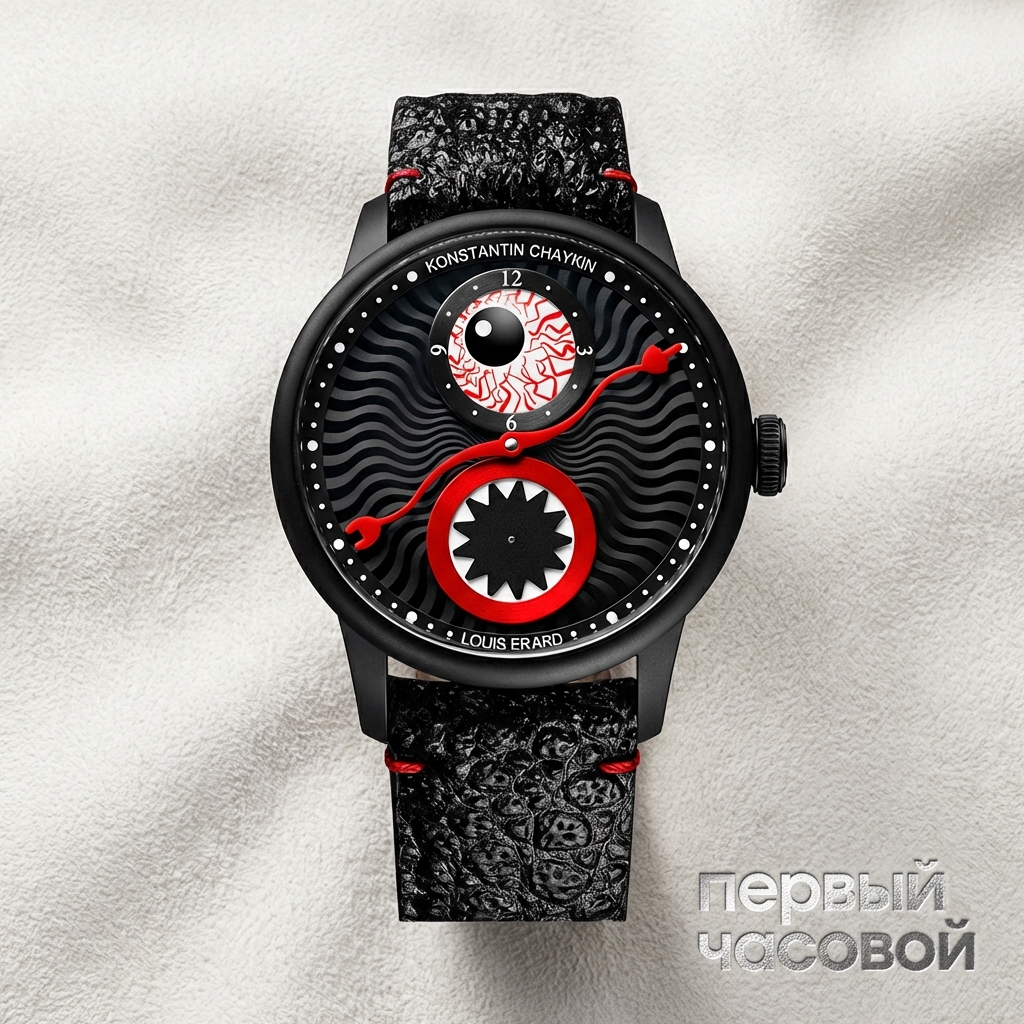 Konstantin Chaikin The Time Eater II представляет собой концептуальное переосмысление классического регулятора через призму сюрреалистической эстетики коллекции Wristmons. Корпус диаметром 39 мм, выполненный из нержавеющей стали, отличается архитектурной строгостью, служащей рамой для сложной геометрии циферблата. Антропоморфная индикация времени реализована посредством двух дисковых счетчиков часов и минут, визуально формирующих «глаза» композиции, в то время как секундная стрелка трансформирована в двунаправленный вращающийся элемент.