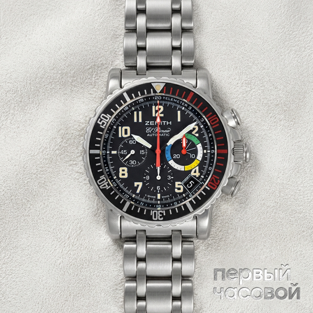 Мнение байера: Это именно тот Zenith, который покупают не ради логотипа, а ради конструктива. Модель Rainbow на базе 405-го калибра — это «трактор» с функцией Flyback, который в свое время стоил вменяемых денег и предлагал функционал, недоступный многим конкурентам из высшего эшелона. Размер 40 мм здесь работает идеально: часы плотно сидят на запястье, не перевешивают и спокойно заходят под манжету, в отличие от современных раздутых корпусов. Сапфир и водонепроницаемость 100 метров делают их пригодными для ежедневной носки без лишней тряски над сохранностью. Теперь о минусах: отсутствие коробки и документов — это существенный удар по ликвидности, продать их быстро и дорого потом будет сложно, коллекционеры любят полный комплект. Однако для конечного потребителя это плюс, так как позволяет зайти в легендарный El Primero по нижней границе рынка. Это часы для тех, кто понимает, что такое 36 000 полуколебаний в час, и готов платить за качественный репассаж, а не за картонную коробку.